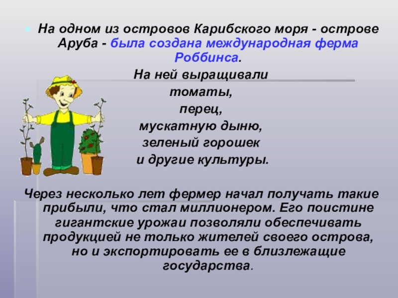 На одном из островов Карибского моря - острове Аруба - была создана международная ферма Роббинса. На ней выращивали томаты, перец, мускатную дыню, зеленый горошек и другие культуры. Через несколько лет фермер начал получать такие прибыли, что