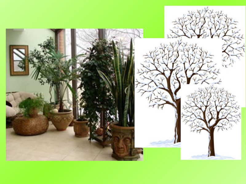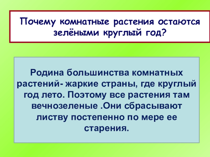 Почему комнатные растения остаются зелёными круглый год?Родина большинства комнатных растений- жаркие страны, где круглый год лето. Поэтому