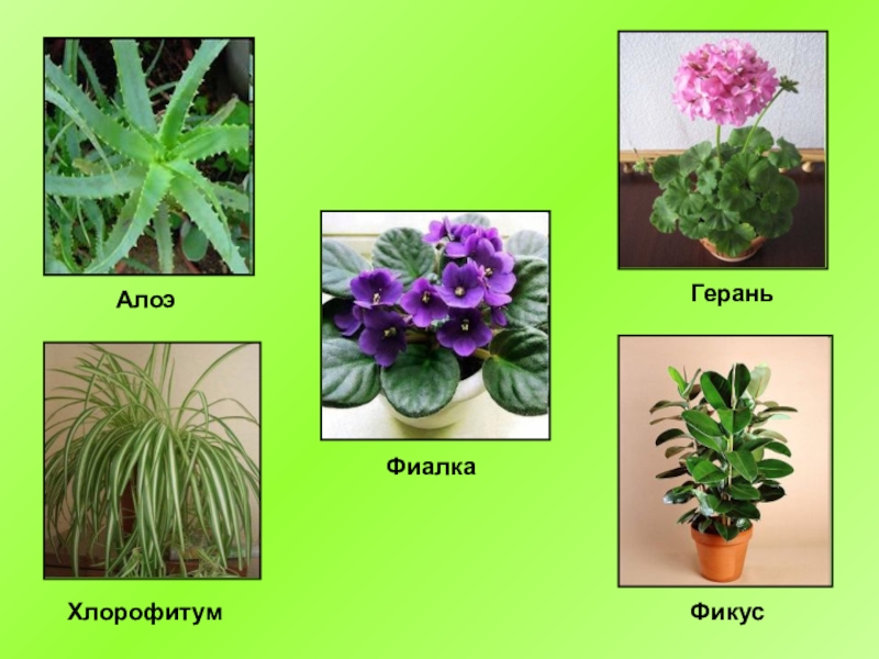 АлоэХлорофитумГераньФиалкаФикус