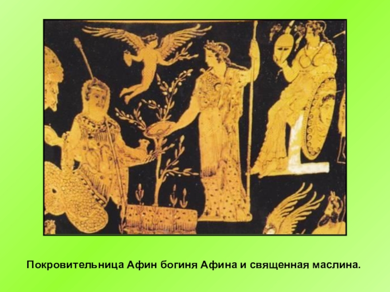Слайд 9Покровительница Афин богиня Афина и священная маслина.