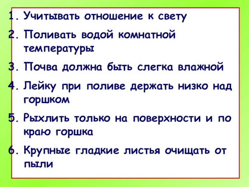 Учитывать отношение к светуПоливать водой комнатной температурыПочва должна быть слегка влажнойЛейку при поливе держать низко над горшкомРыхлить