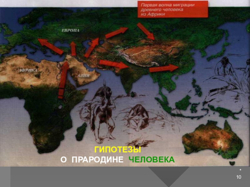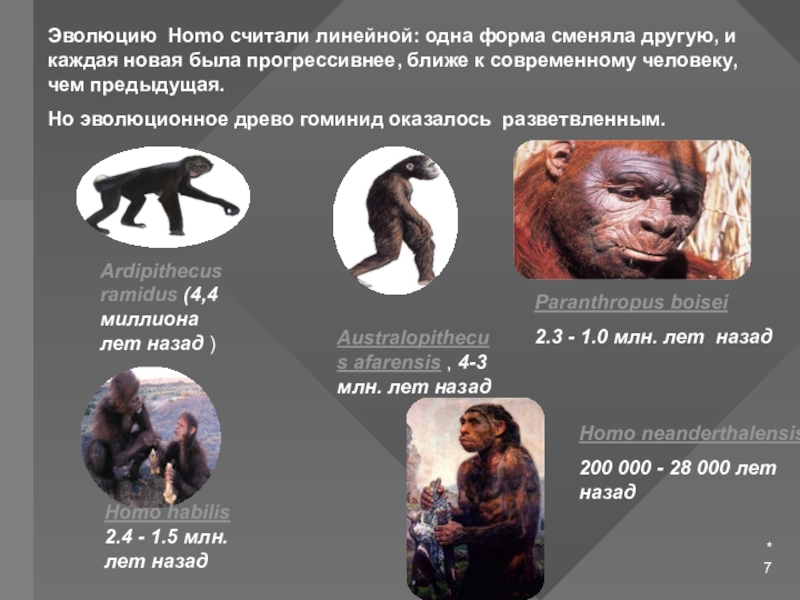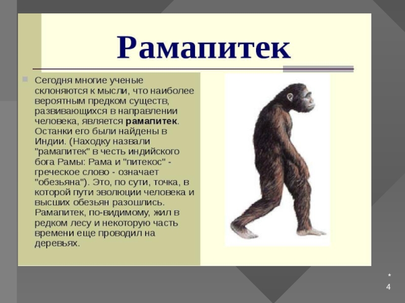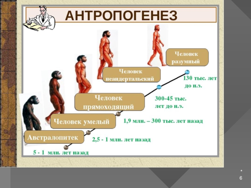 Вид Homo erectus - Человек прямоходящий появился примерно 1 – 1,3 млн. лет назад. Он имел объем мозга 800- 1200 см в кубе, у современного человека – 1200 - 1600 см. куб., умел изготавливать орудия охоты, овладел огнем, видимо, обладал речью. Его прямым потомком стал Homo sapiens, или Человек разумный (150-200 тыс. лет назад).