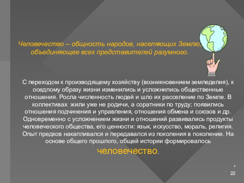 Человечество – общность народов, населяющих Землю, объединяющее всех представителей разумного.