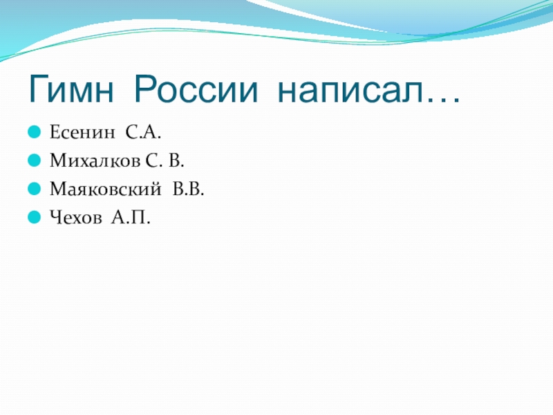Гимн России написал…Есенин С.А.Михалков С. В.Маяковский В.В.Чехов А.П.
