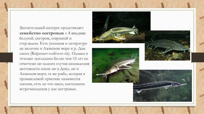 Слайд 7Значительный интерес представляет семейство осетровых с 4 видами: белугой, осетром, севрюгой