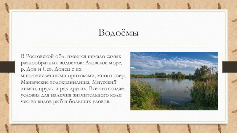 В Ростовской обл. имеется немало самых разнообразных водоемов: Азовское море, p.