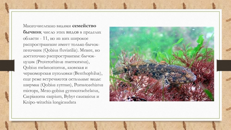 Слайд 9Многочисленно видами семейство бычков; число этих видов в пределах области -
