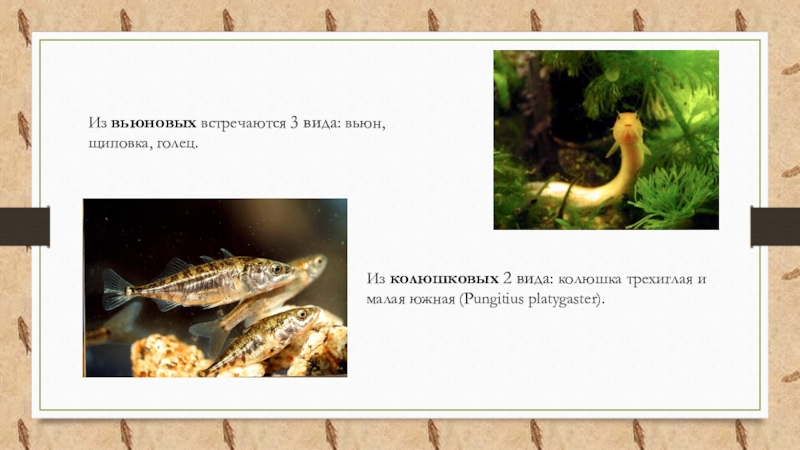 Слайд 10Из вьюновых встречаются 3 вида: вьюн, щиповка, голец.