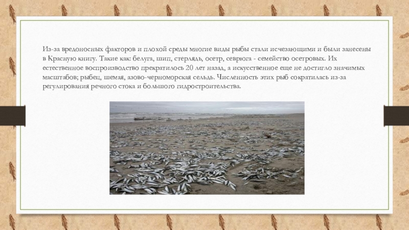 Слайд 11Из-за вредоносных факторов и плохой среды многие виды рыбы стали исчезающими