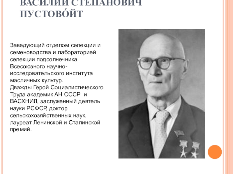 ВАСИ́ЛИЙ СТЕПА́НОВИЧ ПУСТОВО́ЙТЗаведующий отделом селекции и семеноводства и лабораторией селекции подсолнечника Всесоюзного научно-исследовательского института масличных культур.Дважды Герой
