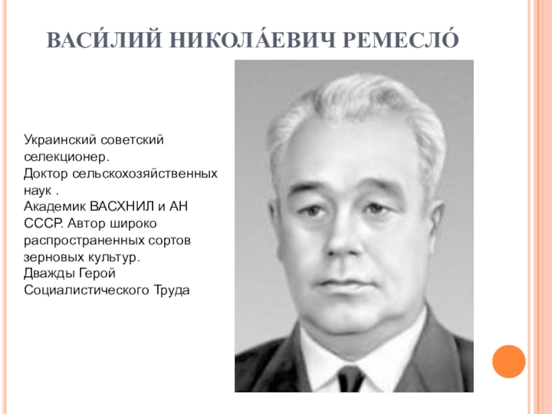 ВАСИ́ЛИЙ НИКОЛА́ЕВИЧ РЕМЕСЛО́Украинский советский селекционер.Доктор сельскохозяйственных наук . Академик ВАСХНИЛ и АН СССР. Автор широко распространенных сортов