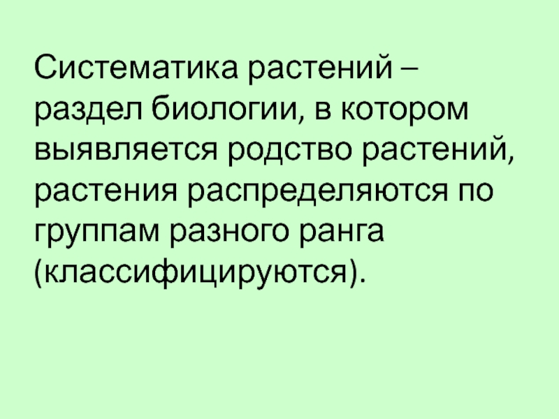 Систематика растений – раздел биологии, в котором выявляется родство растений, растения распределяются по группам разного ранга (классифицируются).
