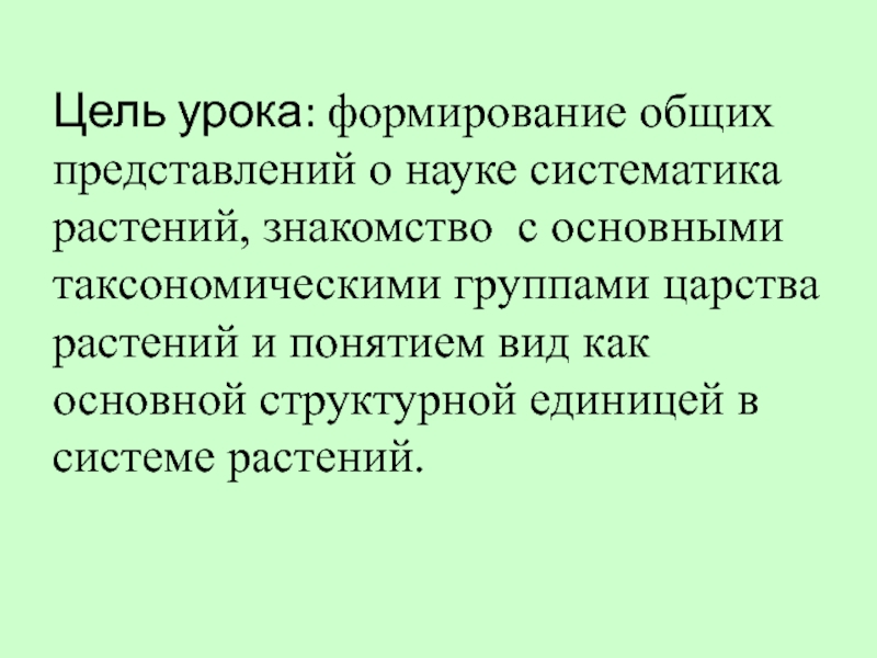 Цель урока: формирование общих представлений о науке систематика растений, знакомство с основными таксономическими группами царства растений и понятием вид как основной структурной единицей в системе растений.