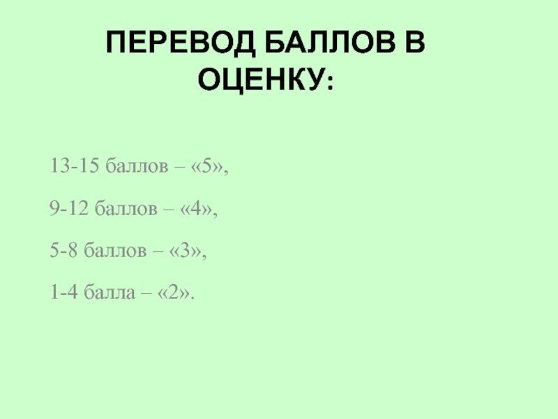 Перевод баллов в оценку:13-15 баллов – «5»,9-12 баллов – «4»,5-8 баллов – «3»,1-4 балла – «2».