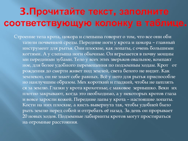 Слайд 183.Прочитайте текст, заполните соответствующую колонку в таблице.
