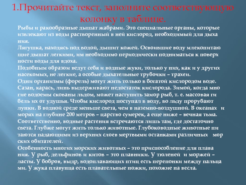 Слайд 121.Прочитайте текст, заполните соответствующую колонку в таблице.