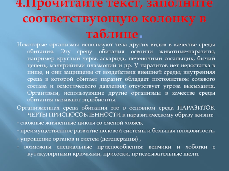 Организменная среда обитания это в основном среда ПАРАЗИТОВ. ЧЕРТЫ ПРИСПОСОБЛЕННОСТИ к паразитическому образу жизни: