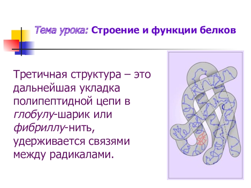 полипептидной цепи в глобулу-шарик или фибриллу-нить, удерживается связями между радикалами.