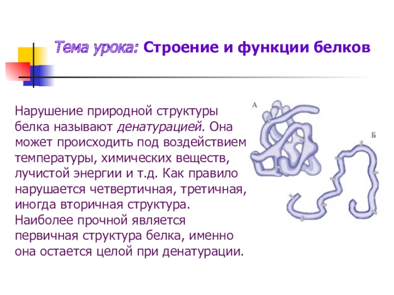 Она может происходить под воздействием температуры, химических веществ, лучистой энергии и т.д. Как правило нарушается четвертичная, третичная, иногда вторичная структура. Наиболее прочной является первичная структура белка, именно она остается целой при денатурации.
