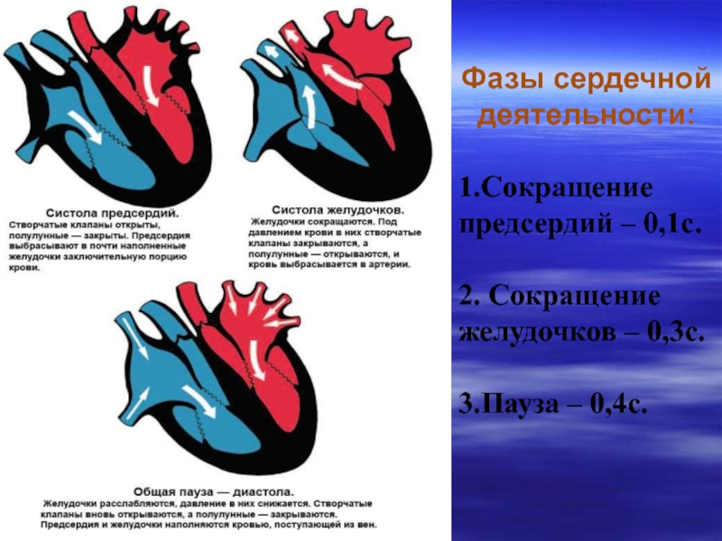 Фазы сердечной деятельности:1.Сокращение предсердий – 0,1с.2. Сокращение желудочков – 0,3с.3.Пауза – 0,4с.