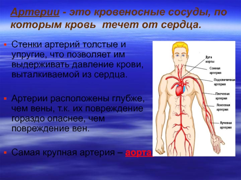 Артерии - это кровеносные сосуды, по которым кровь течет от сердца.Стенки артерий толстые и упругие, что позволяет