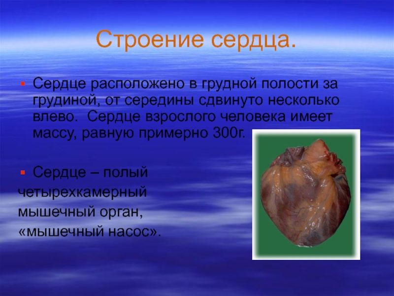 несколько влево. Сердце взрослого человека имеет массу, равную примерно 300г.