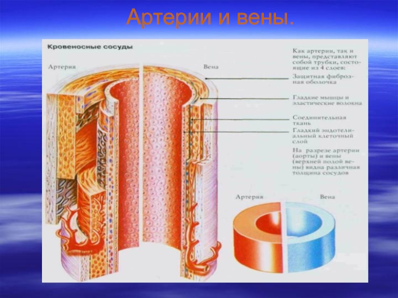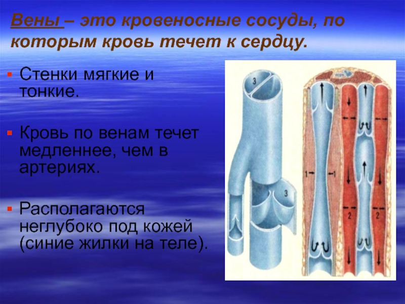 Вены – это кровеносные сосуды, по которым кровь течет к сердцу.Стенки мягкие и тонкие.Кровь по венам течет
