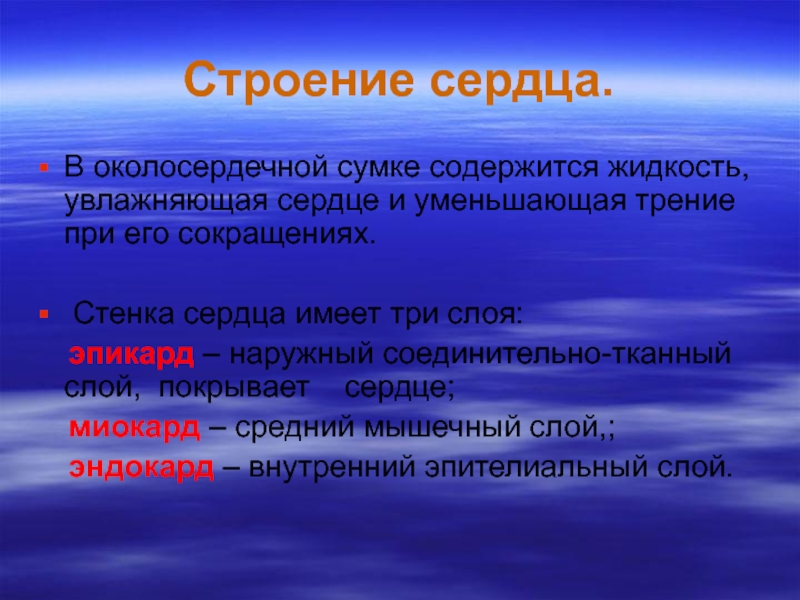 Строение сердца.В околосердечной сумке содержится жидкость, увлажняющая сердце и уменьшающая трение при его сокращениях. Стенка сердца имеет