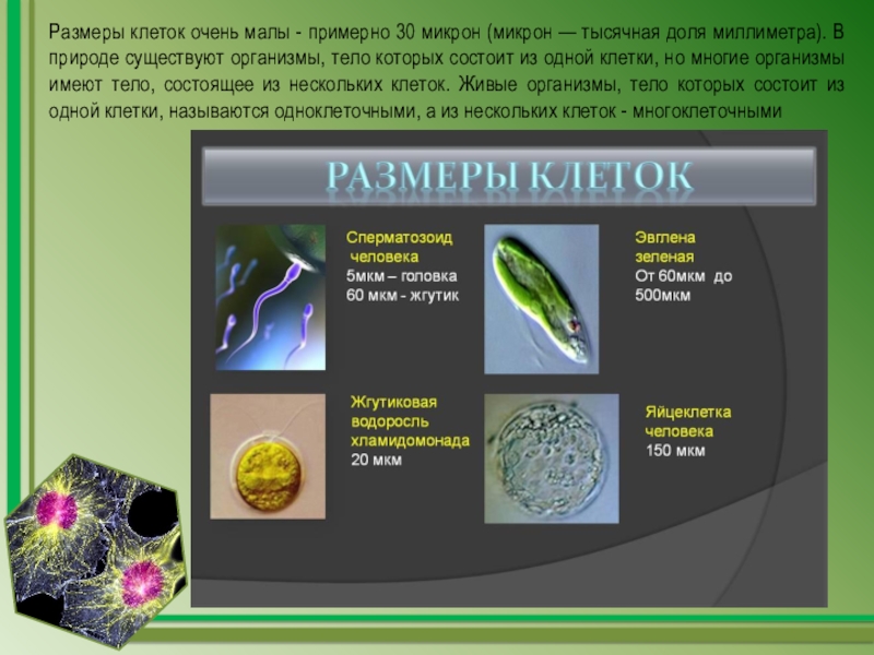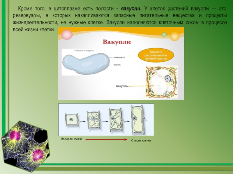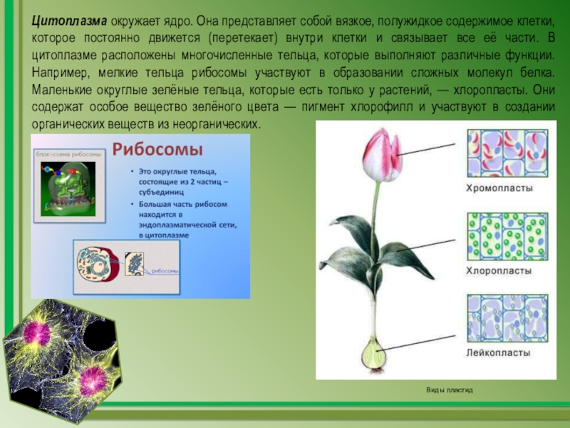Клетки растений, животных и грибов могут быть различными по размерам и форме, но все они имеют одинаковые основные части. Основные части клетки - ядро, цитоплазма, вакуоли и клеточная мембрана.