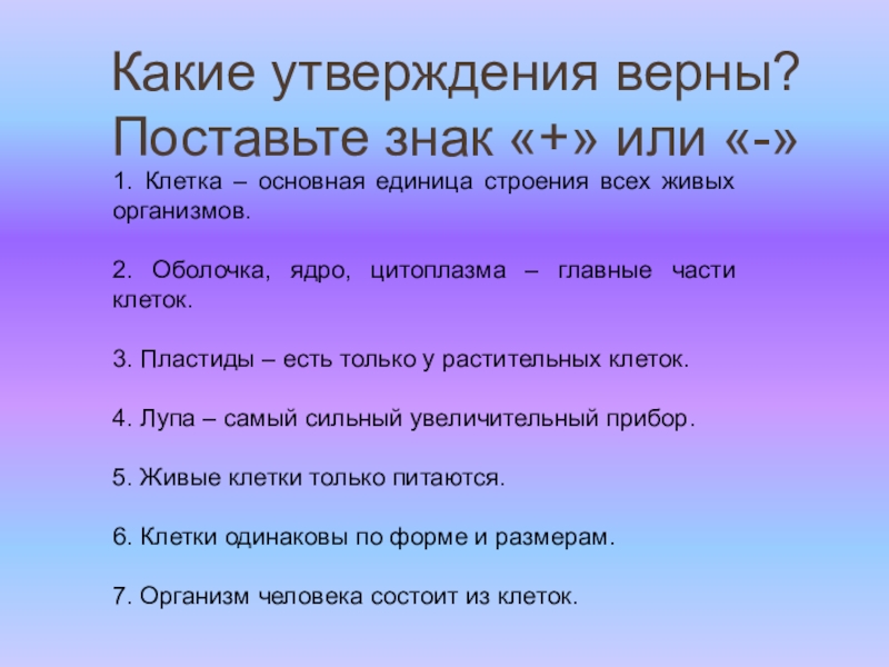 Какие утверждения верны?Поставьте знак «+» или «-»1. Клетка – основная единица строения всех живых организмов. 2. Оболочка, ядро,