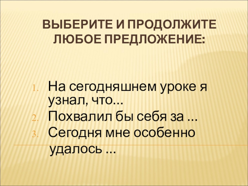 ВЫБЕРИТЕ И ПРОДОЛЖИТЕ ЛЮБОЕ ПРЕДЛОЖЕНИЕ:На сегодняшнем уроке я узнал, что…Похвалил бы себя за …Сегодня мне особенно