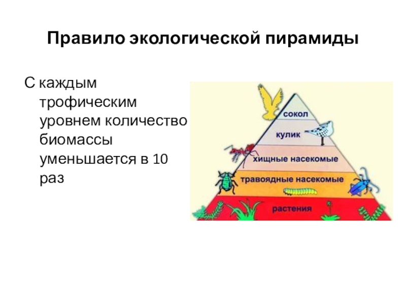 Правило экологической пирамидыС каждым трофическим уровнем количество биомассы уменьшается в 10 раз