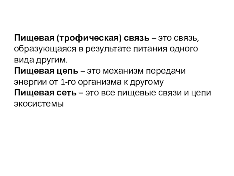 Пищевая (трофическая) связь – это связь, образующаяся в результате питания одного вида другим. Пищевая цепь – это механизм передачи энергии от 1-го организма к другому Пищевая сеть – это все пищевые связи и цепи экосистемы