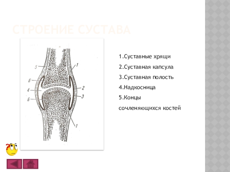 СТРОЕНИЕ СУСТАВА1.Суставные хрящи2.Суставная капсула3.Суставная полость4.Надкосница5.Концы сочленяющихся костей