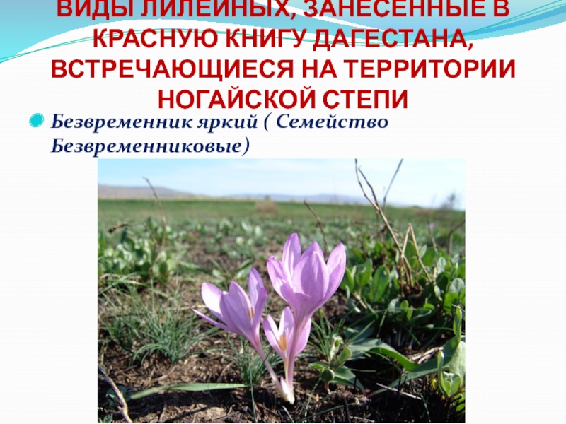 Слайд 31ВИДЫ ЛИЛЕЙНЫХ, ЗАНЕСЕННЫЕ В КРАСНУЮ КНИГУ ДАГЕСТАНА, ВСТРЕЧАЮЩИЕСЯ НА ТЕРРИТОРИИ НОГАЙСКОЙ