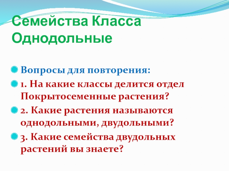 Слайд 2Семейства Класса Однодольные