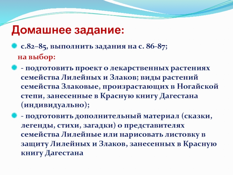 - подготовить дополнительный материал (сказки, легенды, стихи, загадки) о представителях семейства Лилейные или нарисовать листовку в защиту Лилейных и Злаков, занесенных в Красную книгу Дагестана