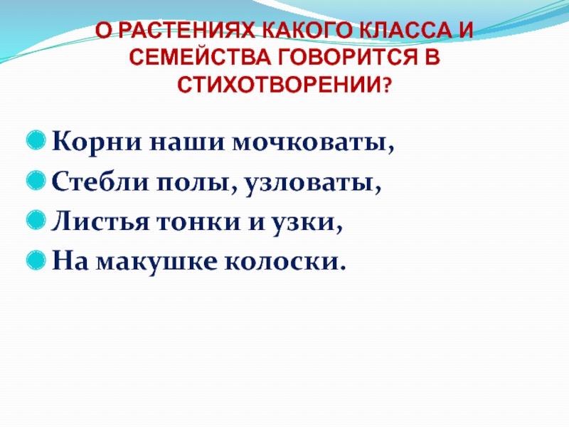 Слайд 38О РАСТЕНИЯХ КАКОГО КЛАССА И СЕМЕЙСТВА ГОВОРИТСЯ В СТИХОТВОРЕНИИ?