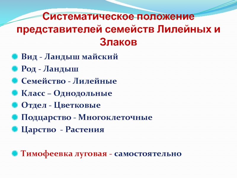 Слайд 51Систематическое положение представителей семейств Лилейных и Злаков