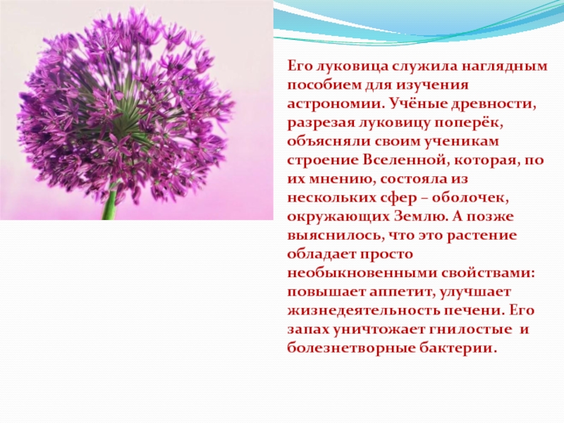 Слайд 61Его луковица служила наглядным пособием для изучения астрономии. Учёные древности, разрезая