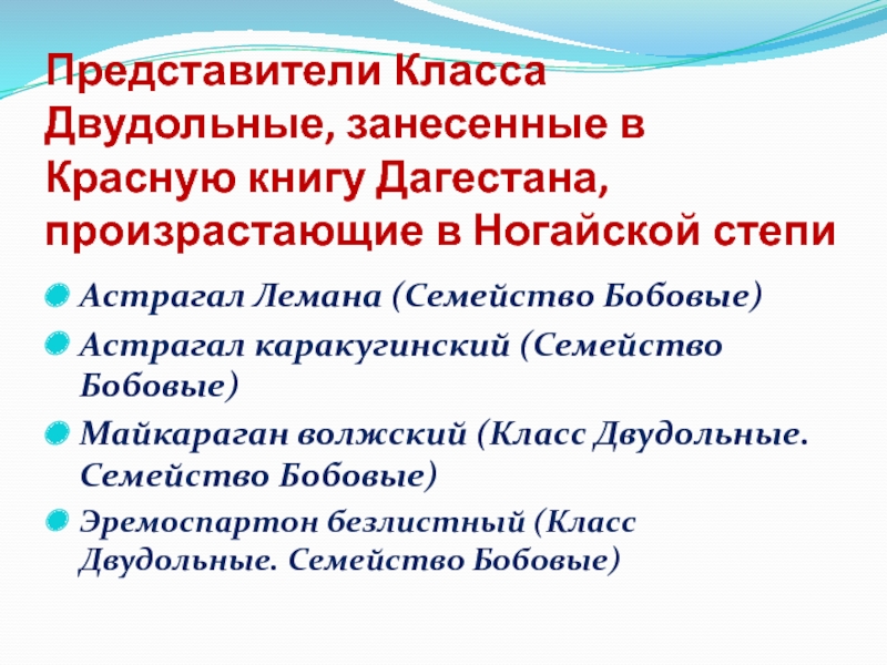 Слайд 9Представители Класса Двудольные, занесенные в Красную книгу Дагестана, произрастающие в Ногайской