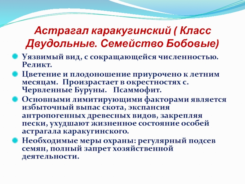 Слайд 12Астрагал каракугинский ( Класс Двудольные. Семейство Бобовые)