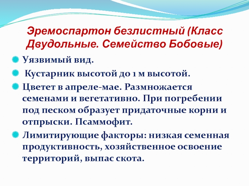 Слайд 16Эремоспартон безлистный (Класс Двудольные. Семейство Бобовые)