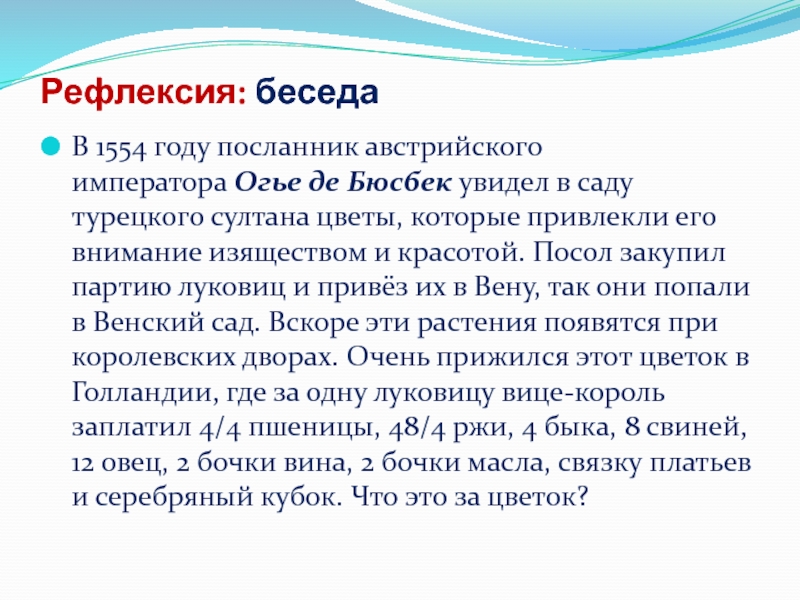 саду турецкого султана цветы, которые привлекли его внимание изяществом и красотой. Посол закупил партию луковиц и привёз их в Вену, так они попали в Венский сад. Вскоре эти растения появятся при королевских дворах. Очень прижился этот цветок в Голландии, где за одну луковицу вице-король заплатил 4/4 пшеницы, 48/4 ржи, 4 быка, 8 свиней, 12 овец, 2 бочки вина, 2 бочки масла, связку платьев и серебряный кубок. Что это за цветок?