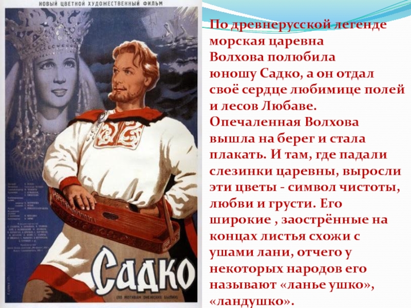 полей и лесов Любаве. Опечаленная Волхова вышла на берег и стала плакать. И там, где падали слезинки царевны, выросли эти цветы - символ чистоты, любви и грусти. Его широкие , заострённые на концах листья схожи с ушами лани, отчего у некоторых народов его называют «ланье ушко», «ландушко».