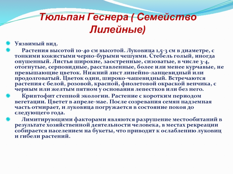Слайд 35Тюльпан Геснера ( Семейство Лилейные)