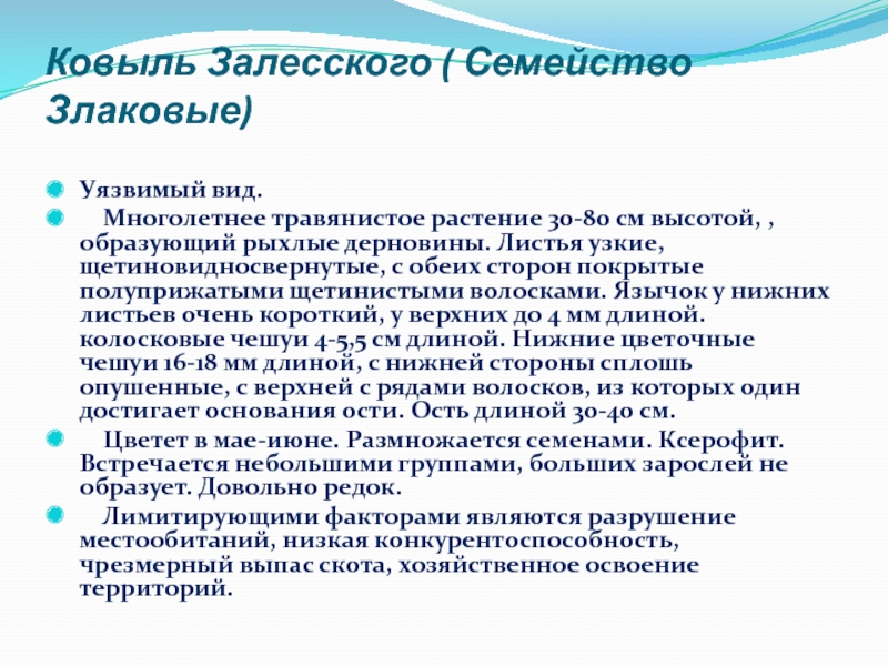 Слайд 50Ковыль Залесского ( Семейство Злаковые)