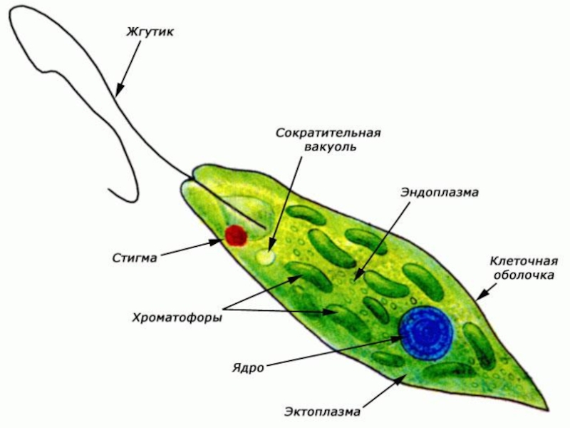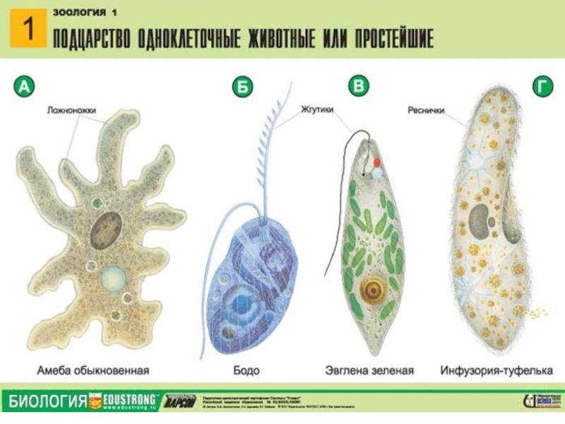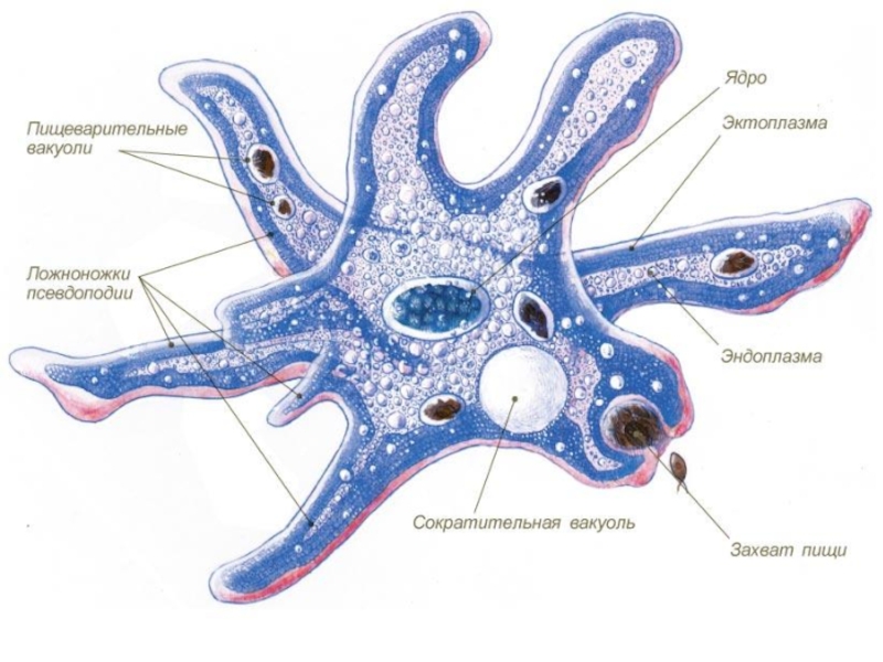 Строение тела простейшего типично для эукариотической клетки. Имеются органеллы общего (митохондрии, рибосомы, клеточный центр, ЭПС и др.) и специального назначения. К последним относятся органы движения: ложноножки, или псевдоподии (временные выросты цитоплазмы), жгутики, реснички, пищеварительные и сократительные вакуоли. Органоиды общего значения присущи всем эукариотическим клеткам.