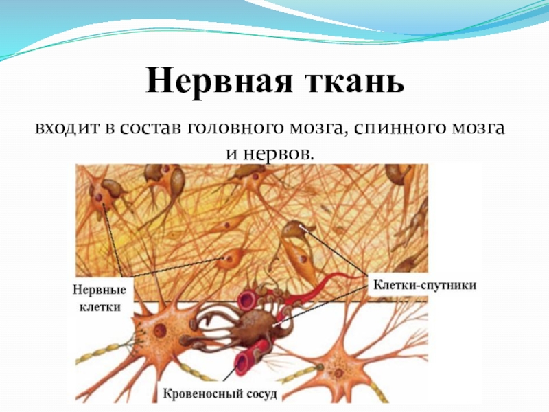 Нервная ткань входит в состав головного мозга, спинного мозга и нервов.