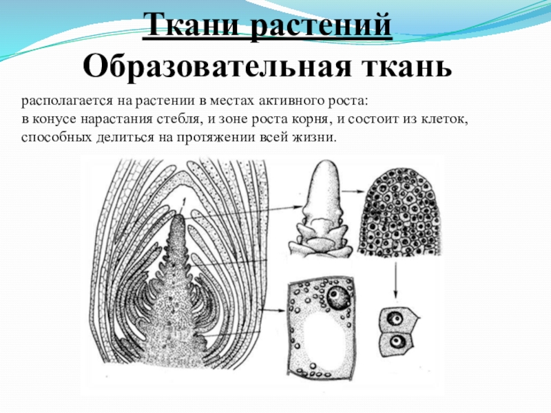 Ткани растений Образовательная ткань располагается на растении в местах активного роста: в конусе нарастания стебля, и зоне